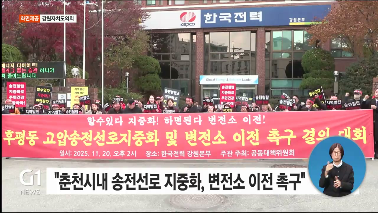 지역 주민과 박기영 강원도의원, 김보건, 유환규 춘천시의원 등 60여 명은 어제(20일) 한국전력 강원본부 앞에서 결의 대회를 열고, 고압송전선로 지중화와 변전소 이전을 촉구했습니다.