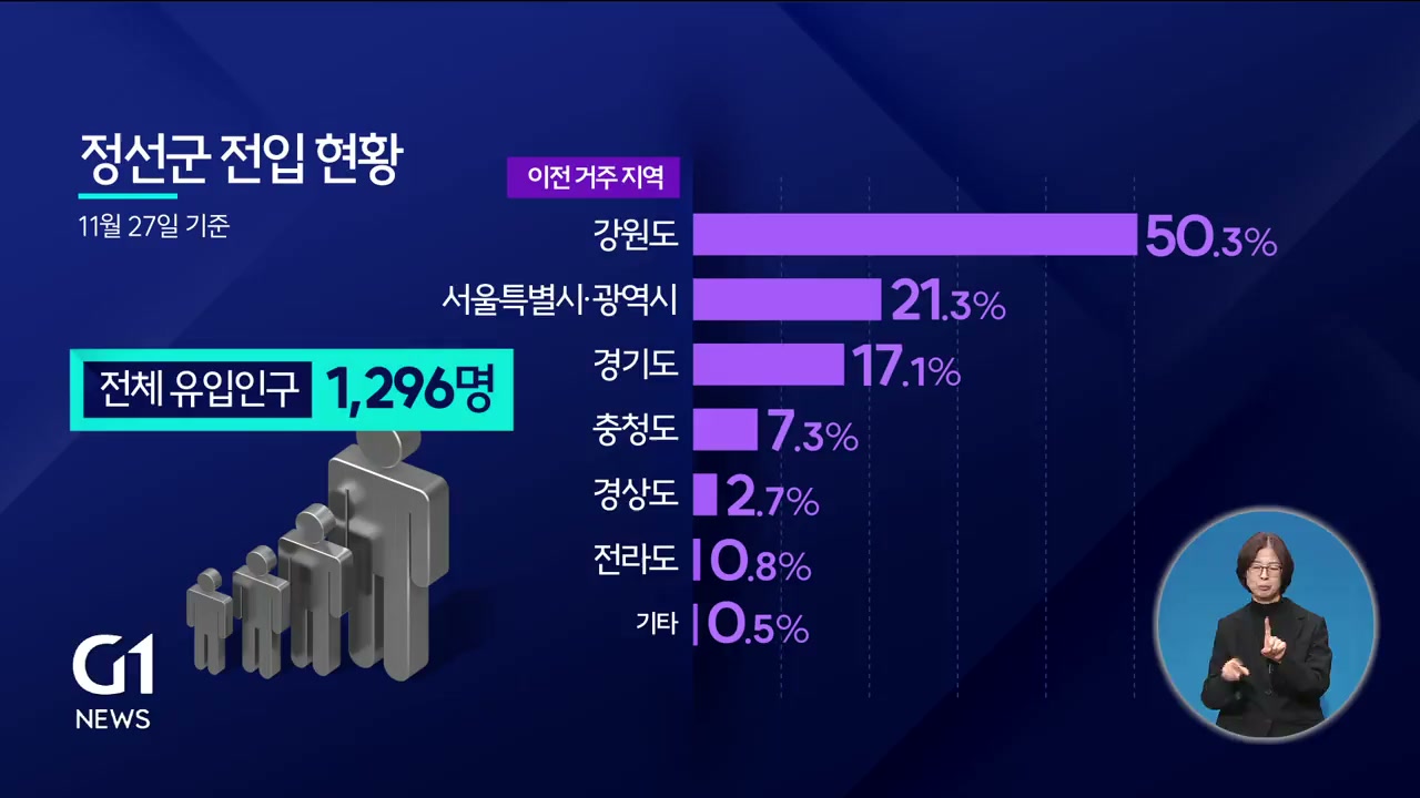 /지난달 27일 기준 정선군으로 유입된 인구는 1,296명.