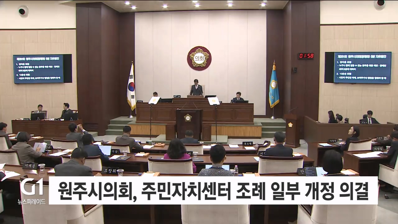 원주시의회가 제263회 임시회를 열고 '원주시 주민자치센터 설치 및 운영 조례 일부 개정 조례안'을 심의 의결했습니다.