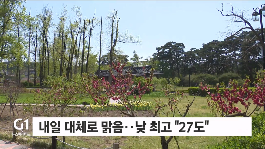 아침 최저기온은 영상 5도에서 13도, 낮 최고기온은 영서권 영상 25도에서 27도, 영동권 영상 21도에서 23도 사이의 분포를 보이겠습니다.