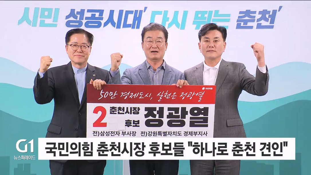 국민의힘 춘천시장 후보로 선출된 정광열 후보와 공천에서 탈락한 후보들이 오늘(23일) 기자회견을 열고 단합 의지를 밝혔습니다.