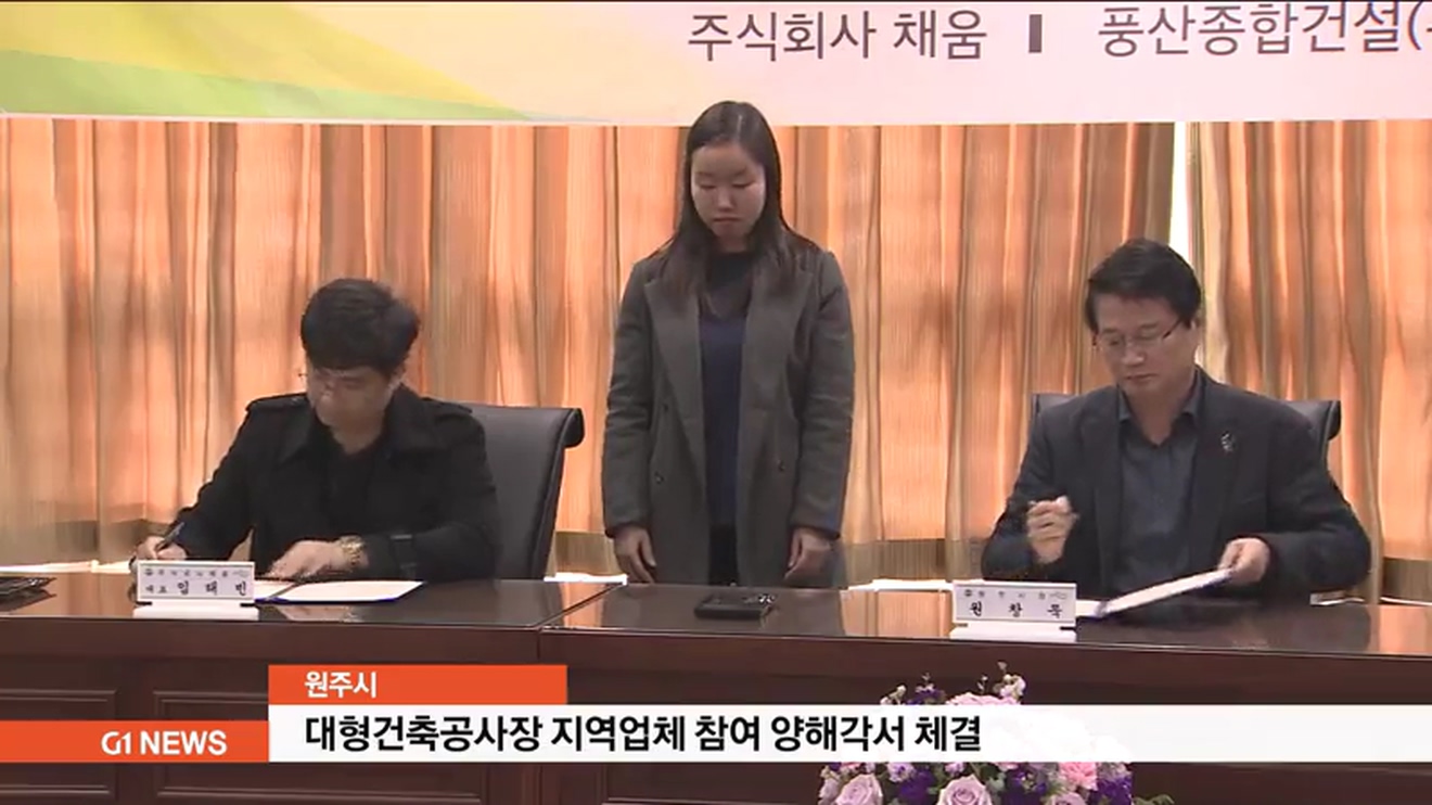 원주시는 오늘 시청 투자상담실에서 건설업체 2곳과 대형건축공사에 지역업체가 참여하게 하는 내용의 양해각서를 체결했습니다.
