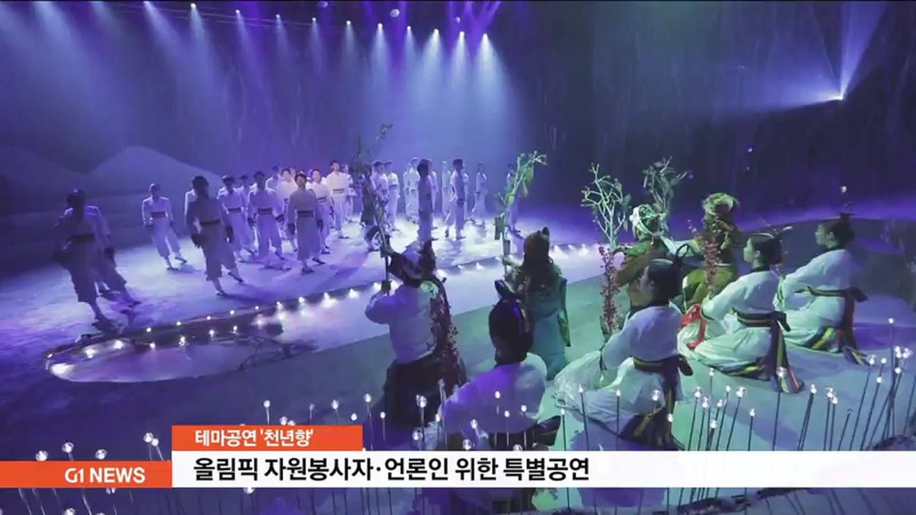 강원문화재단과 도립무용단 등이 참가한 테마공연 '천년향'은 강원도의 자연과 사람들의 이야기를 담아낸 한국적 판타지 공연으로 매회 공연마다 입장권 매진을 기록하며 문화올림픽 성공 분위기를 이끌고 있습니다.