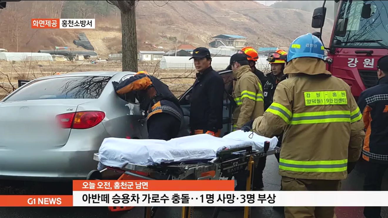 홍천서 승용차 가로수 충돌‥1명 사망.3명 부상