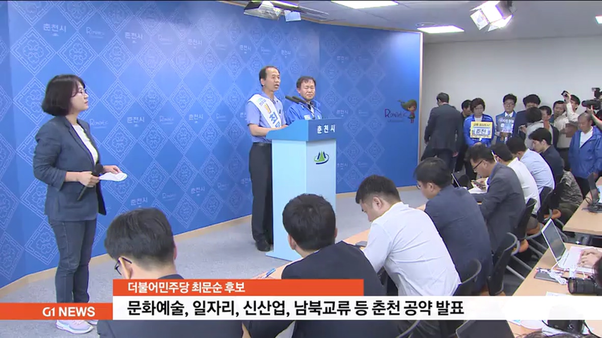더불어민주당 최문순 후보는 춘천시청에서 이재수 춘천시장 후보와 합동 기자회견을 갖고, "춘천을 문화예술과 일자리, 신산업과 남북교류, 교통의 중심 도시로 만들겠다"고 공약했습니다.