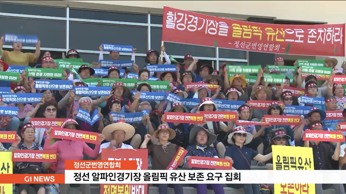 정선군번영연합회 회원과 각 읍.면 이장협의회, 사회단체 회원 등 300여 명은 오늘 낮 12시 30분부터 정선 알파인경기장의 올림픽 유산 보존을 요구하는 집회를 열었습니다.
