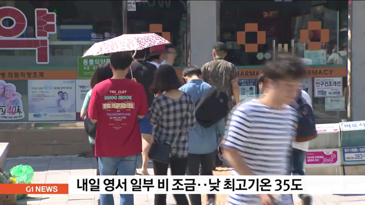 아침 최저기온은 21도에서 28도의 분포를 보이겠고, 낮 최고기온은 30도에서 35도로 오늘과 비슷하겠습니다.