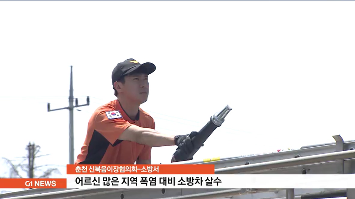 춘천 신북읍이장협의회와 신북119안전센터는 오늘(2일) 노인들이 많이 거주하는 신북 읍사무소와 인근 아파트 주변 마을 길에 대한 소방차 물뿌리기 행사를 가졌습니다.