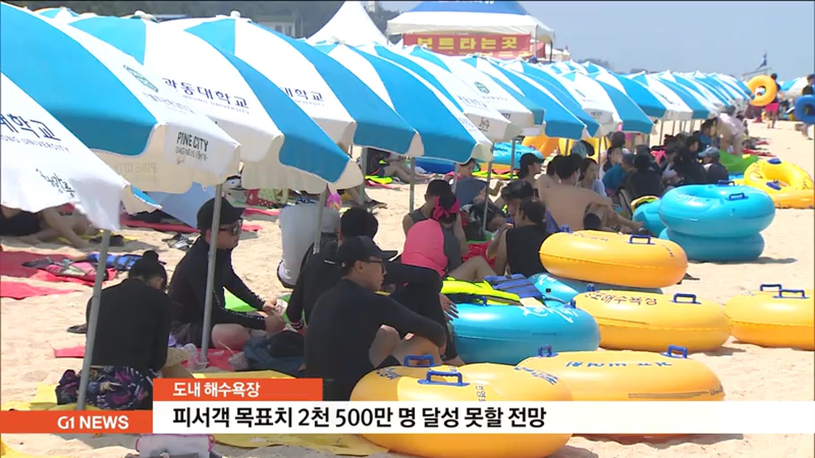 기록적인 폭염 탓에 도내 동해안 해수욕장을 찾은 피서객 수가 당초 목표치인 2천500만명에 못미칠 것으로 전망됩니다.