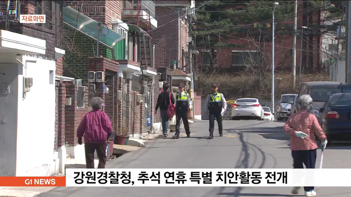 강원지방경찰청은 오는 26일까지를 추석 명절 특별치안 활동 기간으로 정하고, 유흥가 밀집 지역을 비롯해 현금 다액취급 업소와 원룸밀집 지역 등 범죄 취약지역에 대한 맞춤형 치안활동을 전개한다고 밝혔습니다.
