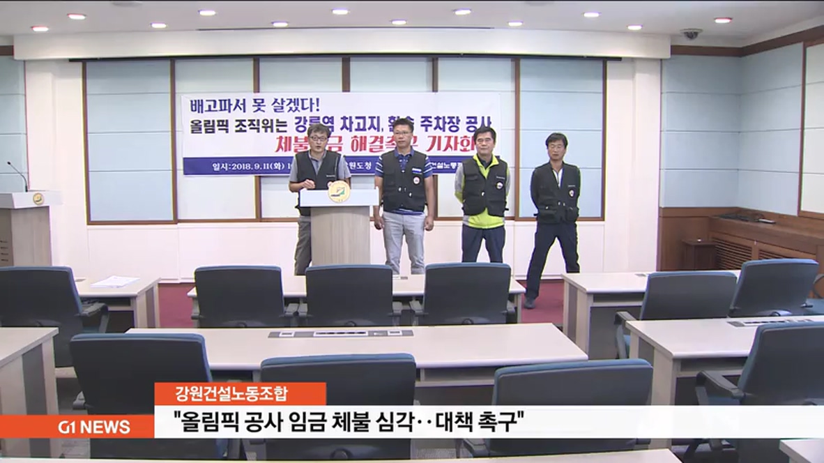 강원건설노동조합은 도청에서 기자회견을 갖고, "동계올림픽 그랜드스탠드 공급 업체와, 경기장 컨테이너 공급 업체, 그리고 강릉역 차고지와 환승 주차장 조성 공사에 참여했던 노동자 들이 장비 임대료와 임금 체불로 고통을 겪고 있다"고 주장했습니다.
