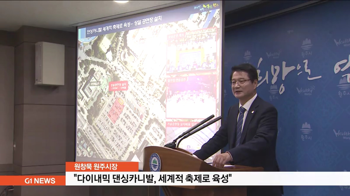 원창묵 원주시장은 오늘 시청에서 정례 브리핑을 열고, "다이내믹 댄싱카니발을 세계적인 축제로 도약시키기 위해, 내년에 10억원을 들여 따뚜공연장 인근에 천 800㎡ 규모로 축제 전용 상설 공연장을 건립할 계획"이라고 밝혔습니다.