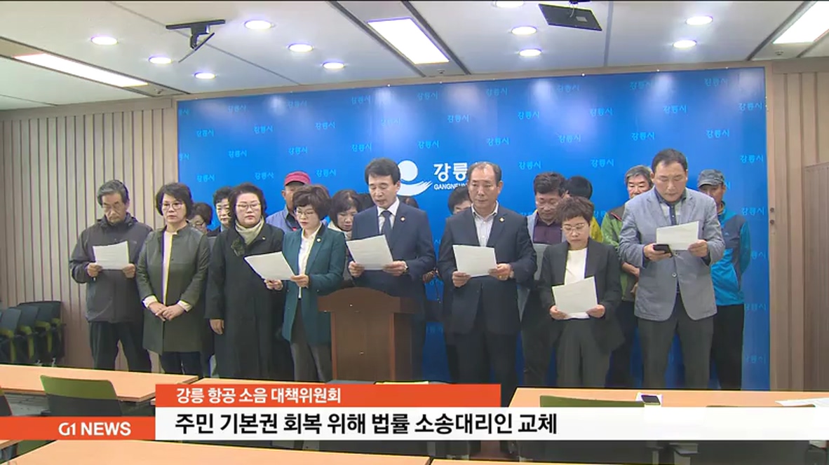 강릉 항공 소음 대책위는 강릉시청에서 기자 회견을 열고, "지난 2005년부터 주민 소송을 대리하고 있는 두 곳의 법률사무소가 수임료를 과다하게 책정하고, 배상금 지급 업무도 불투명하게 처리하고 있다"며 법률 소송대리인 변경 이유를 설명했습니다.