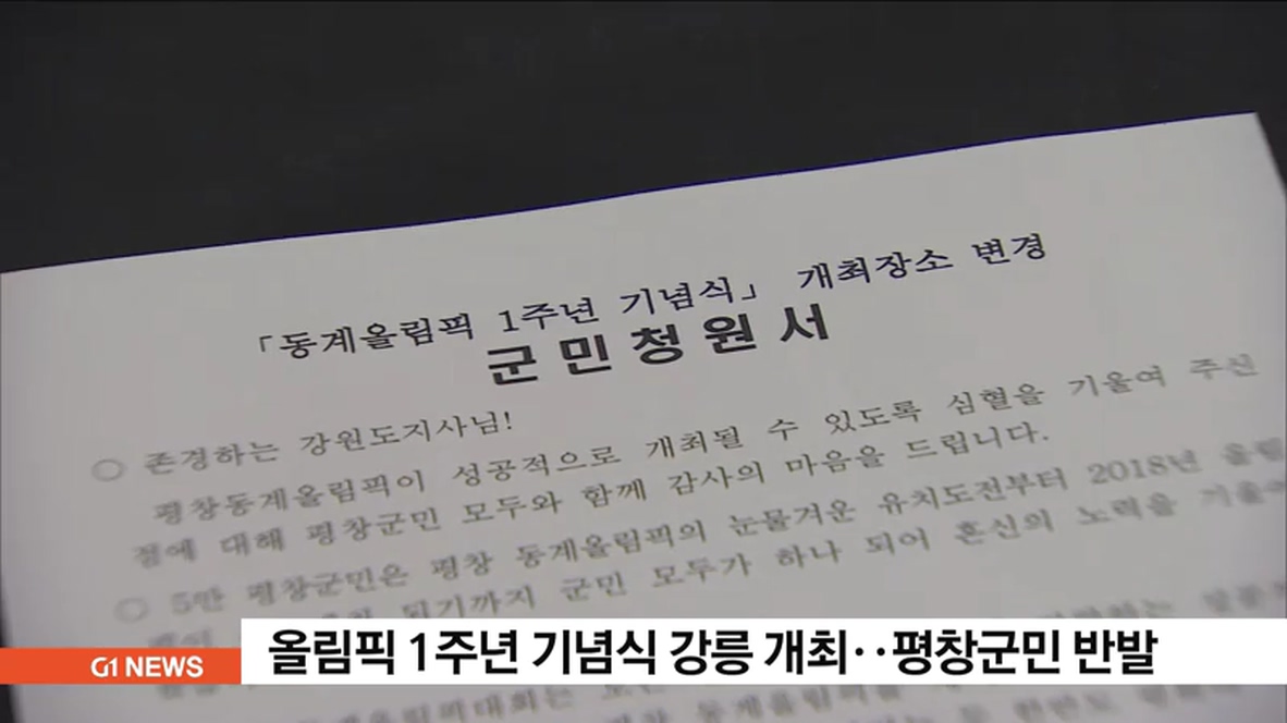 평창군번영회는 강원도에 청원서를 보내 "기념식을 강릉에서 개최하는 것은 올림픽 유치를 위해 20여년 동안 공들인 평창군민의 노력을 무시하는 결정"이라며 "올림픽 주개최지면서 남북평화의 상징인 평창에서 1주년 행사를 개최하는 것이 마땅하다"고 주장했습니다.