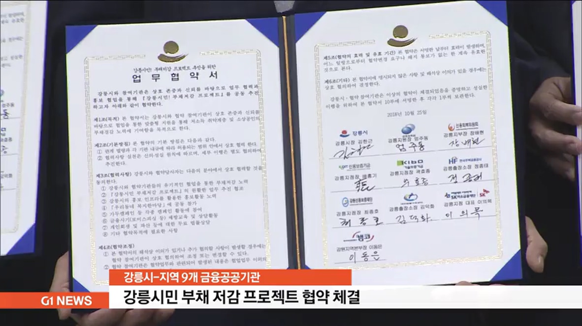 강릉시는 금융감독원과 신용회복위원회, 법률구조공단 등 지역 내 9개 금융 공공기관과 '강릉시민 부채 저감 프로젝트 협약식'을 갖고, 시민들의 빚부담을 덜어 주기 위한 공동 업무를 추진하기로 했습니다.