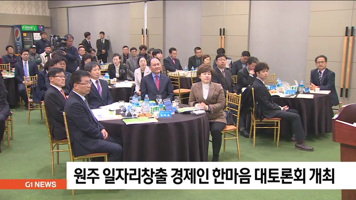 원주 지역일자리 창출과 고용안정을 위한 지역 경제인 한마음 대토론회가 오늘 원주 아모르 컨벤션웨딩에서 지역 경제인 등 100여명이 참석한 가운데 열렸습니다.