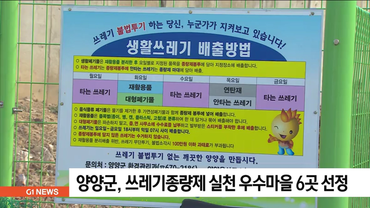 양양군은 생활쓰레기 감량과 자원 재활용에 대한 자발적 참여를 이끌어내기 위해 쓰레기 종량제 실천 우수마을을 선정했습니다.