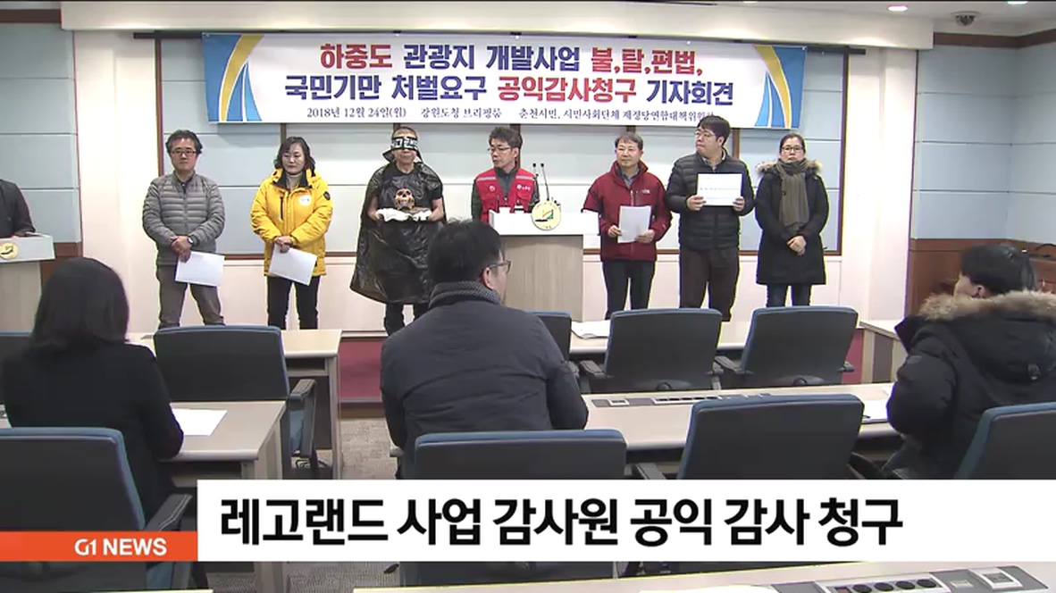 춘천시민연대와 정의당, 노동당 등 15개 단체와 정당은 오늘 도청 브리핑룸에서 기자회견을 열고, 전 세계 유일한 선사유적을 깔아뭉개고 100년간 무상으로 땅을 빌려주는 것도 모자라 이제는 800억원을 멀린사가 요구하는대로 주겠다는 강원도가 어이가 없다면서 춘천시민 300명 이상의 위임을 받아 감사원에 공익 감사를 청구한다고 밝혔습니다.