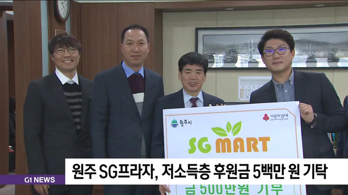 원주지역 향토 유통기업인 SG프라자는 오늘 원주시청을 방문해 김광수 원주 부시장에게 경제적으로 어려운 저소득층 가정에 써달라며 지정기탁 후원금 5백만원을 기탁했습니다.