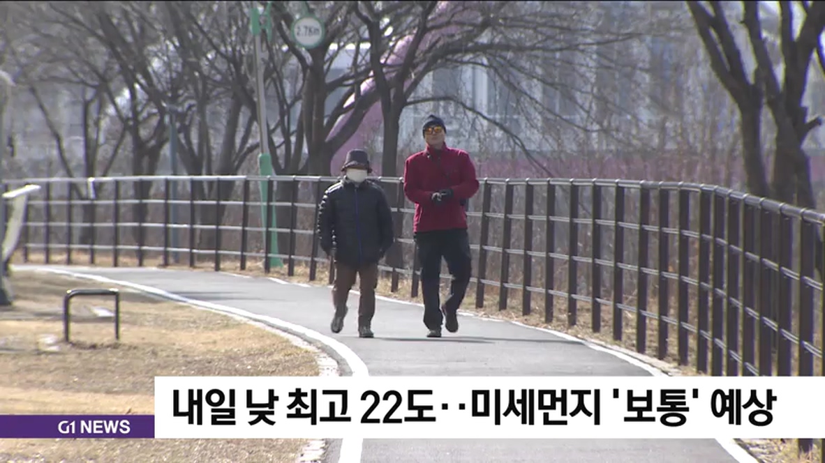 내일 아침 최저기온은 영서지역이 영하 3도에서 영상 2도, 영동지역은 영상 8도에서 10도의 분포를 보이겠고, 낮 최고기온은 15도에서 22도로 예상됩니다.