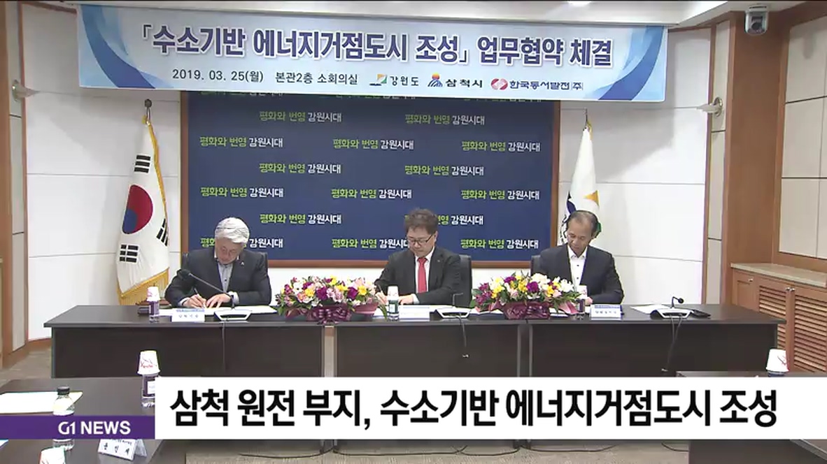 강원도와 삼척시, 한국동서발전이 삼척 원전 예정구역에 '수소기반 에너지거점 도시'를 조성하기 위한 업무 협약을 맺었습니다.