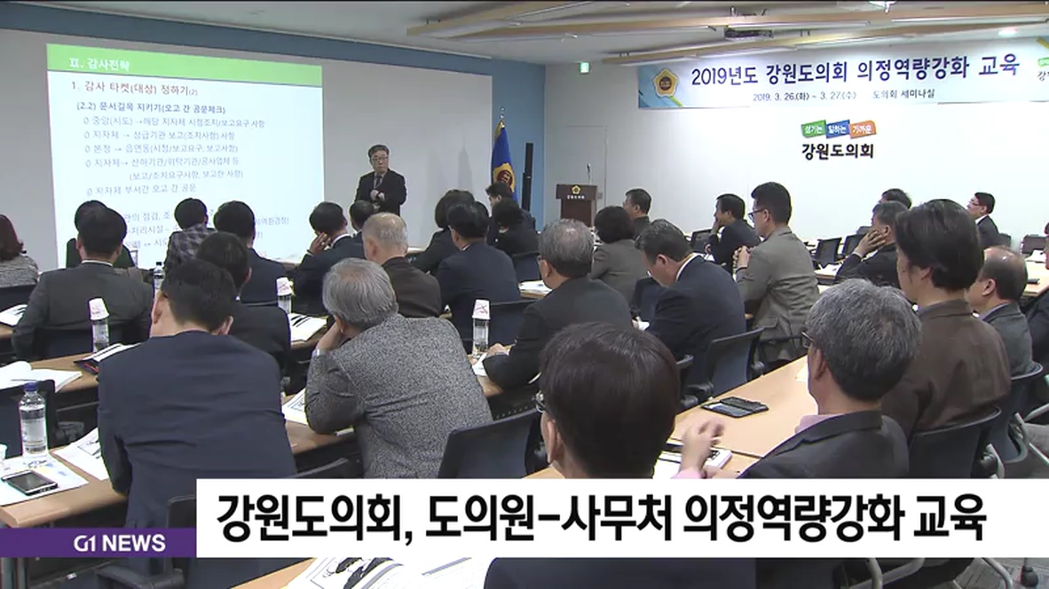 현직 도의원들과 의회 사무처 직원들의 역량 강화를 위한 '2019년 의정역량강화 교육'이 강원도의회에서 시작됐습니다.