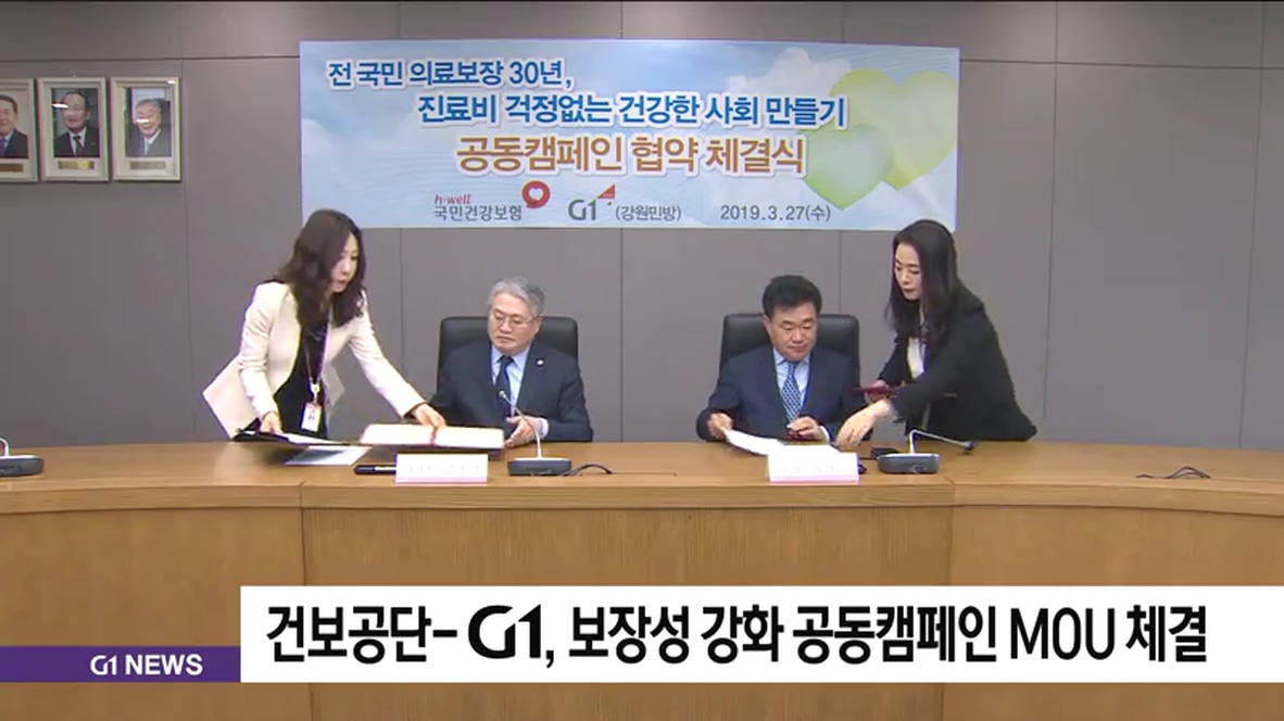 국민건강보험공단과 G1 강원민방은 오늘 건보공단에서 '전 국민 의료보장 30년, 진료비 걱정 없는 든든한 사회 만들기'를 위한 공동캠페인을 추진하는 내용의 업무협약을 체결했습니다.