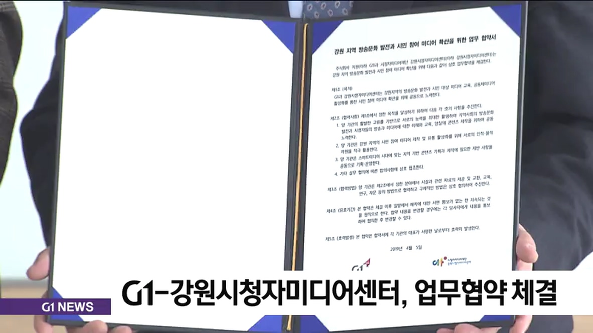 G1 강원민방과 강원시청자미디어센터는 강원지역 방송문화 발전과 방송과 뉴미디어 영역에 시민 참여 확산을 위한 업무협약을 체결했습니다.