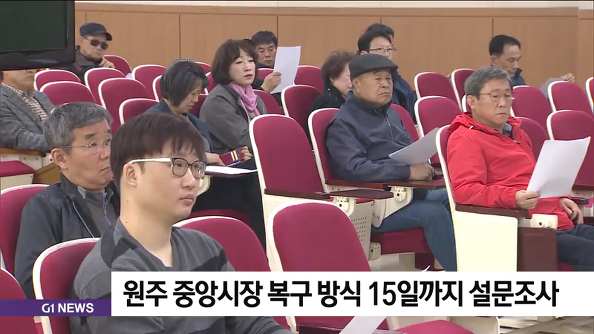 원주중앙시장번영회는 오늘 화재 피해를 입은 나동 건물주들을 대상으로 간담회를 열고, 구조보강과 재건축, 4개동 모두 재건축 등 세가지 안에 대해 오는 15일까지 설문조사를 벌이기로 했습니다.