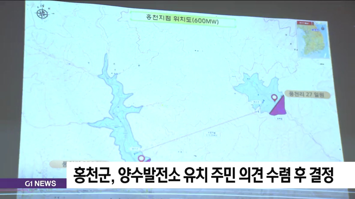 홍천군은 양수발전소 발전기를 기준으로 반경 5km 이내 포함되는 구성포 2리와 풍천1,2리, 야시대2리 주민들을 대상으로 다음달 10일까지 의견 수렴 절차를 거쳐 발전소 유치 신청 여부를 최종 결정하겠다고 밝혔습니다.