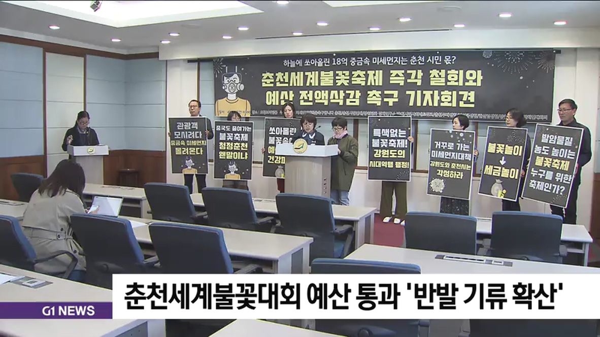 춘천시민사회단체들로 구성된 '춘천세계불꽃축제 반대모임'도, 예산 낭비 논란과 미세먼지 문제 등 어느 것 하나 해결되지 않은 상황에서 불꽃대회 예산을 세운 춘천시는 물론, 이를 아무런 견제 없이 통과시킨 춘천시의회 모두 한심하다고 강도 높게 비판했습니다.