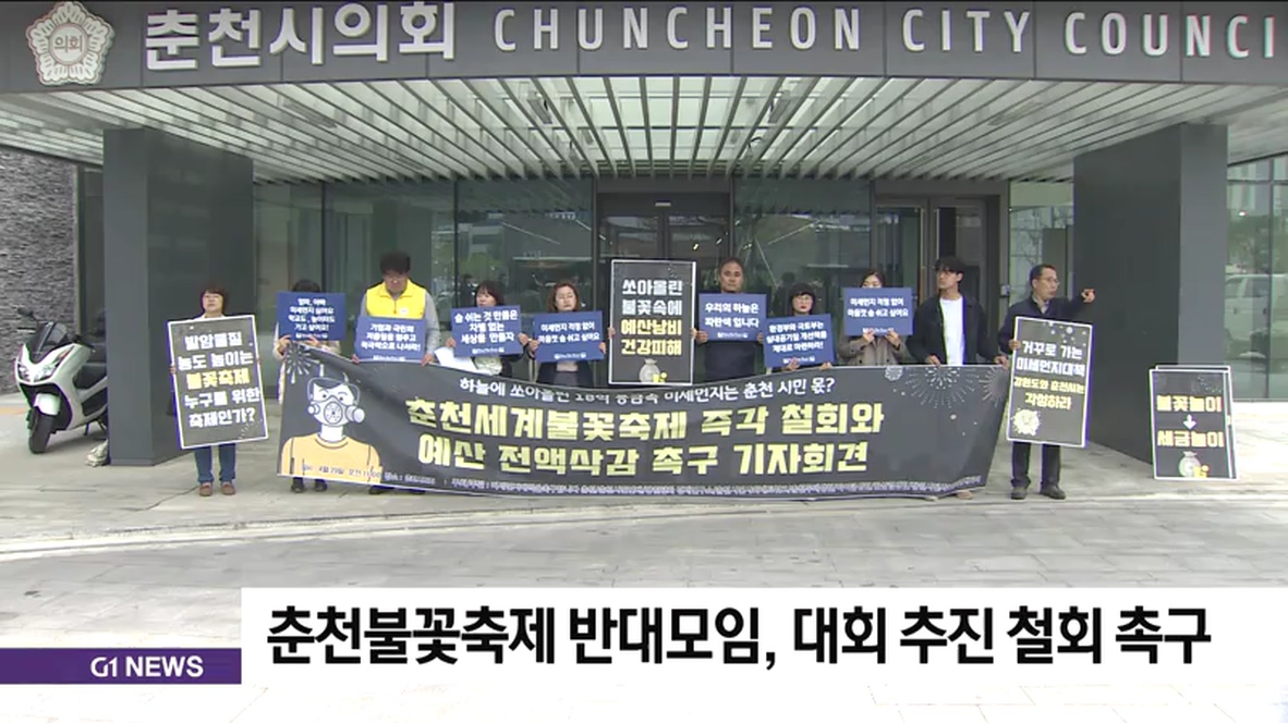이들 단체는 지난 25일, 도의회 승인도 못 받고 예산 전액을 삭감 당한 14억원 규모의 춘천세계불꽃축제 예산이 기형적으로 춘천시의회 상임위를 통과했다며, 예결위와 본회의에서 관련 예산을 전액 삭감하고 춘천시는 대회 추진을 즉각 철회할 것을 주장했습니다.
