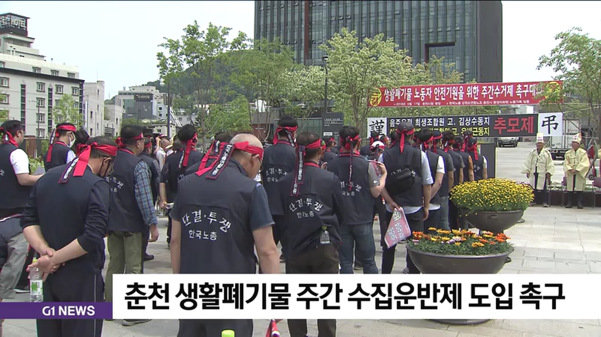 조합원들은, 춘천시의 잘못된 청소 정책으로 환경미화원들이 악취로 인한 건강상 피해는 물론, 야간 음주운전자 사고에 내몰리고 있다며 생활폐기물 수집과 운반을 낮시간에 할 수 있도록 근무시간을 전환해달라고 주장했습니다.