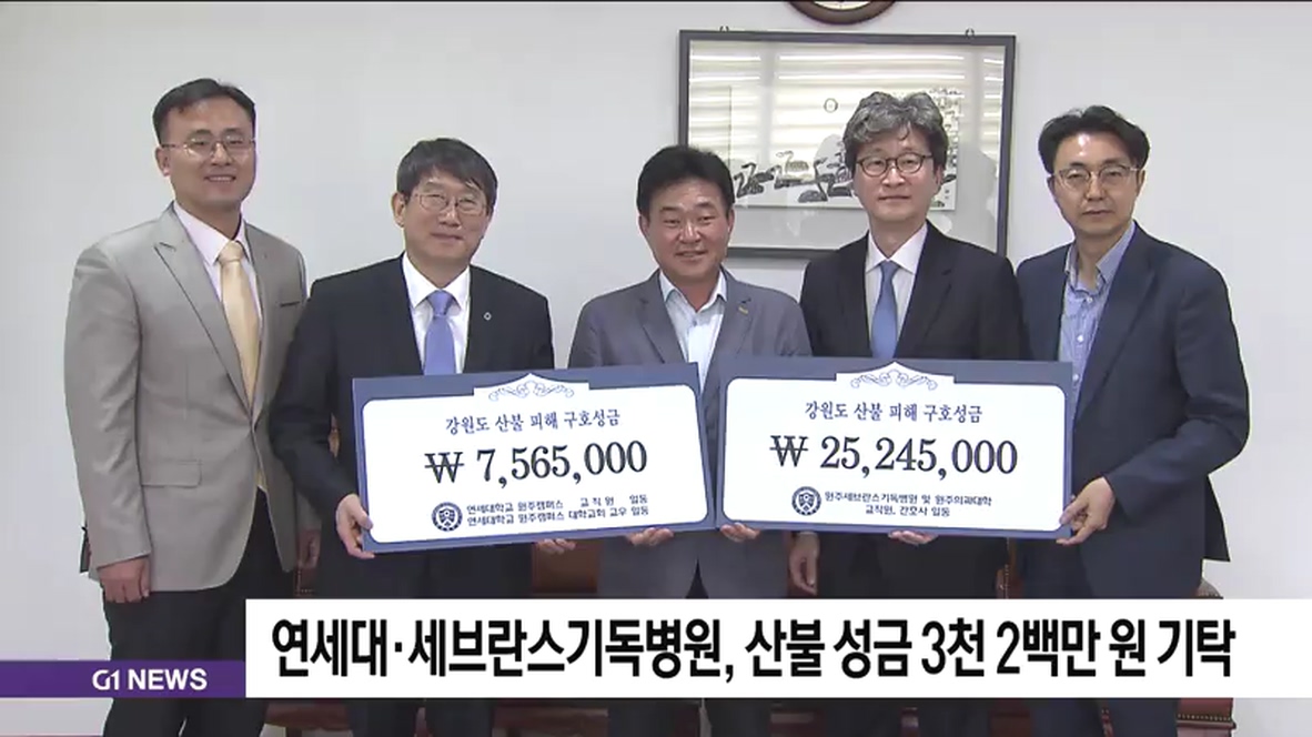 윤영철 연세대학교 원주캠퍼스 부총장과 백순구 원주세브란스기독병원장은 오늘, G1강원민방을 방문해, 산불 피해 복구와 이재민 지원에 써달라며 성금을 전달했습니다.