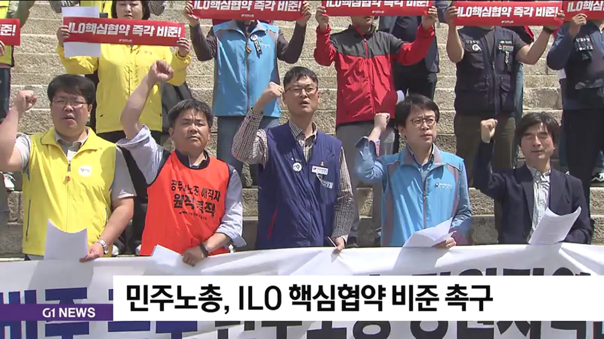 민주노총은 ILO 핵심협약 비준이 문재인 대통령의 핵심 공약 중 하나인데, 정부가 국내법 개정이 선행돼야 ILO 핵심협약을 비준하겠다는 입장을 고수하고 있다며, 조속한 비준을 요구했습니다.