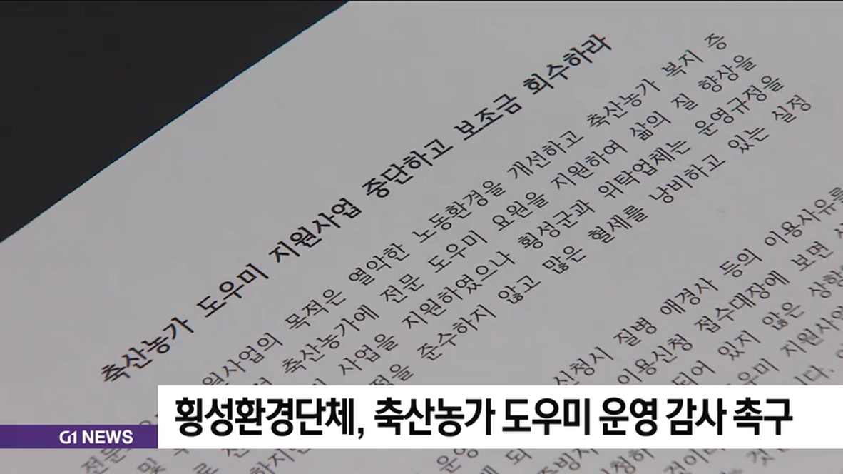 횡성지역 환경단체가 축산농가 도우미 지원사업이 부실하게 운영되고 있다며, 성명서를 내고 사업 중단과 보조금 회수를 촉구했습니다.