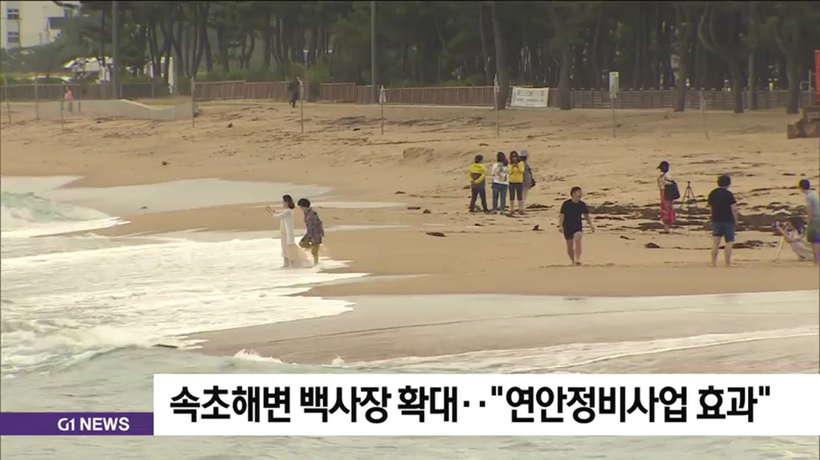 속초시에 따르면, 해마다 침식이 반복되던 속초해수욕장은 2015년 연안정비 사업 이후 북쪽 해수욕장 백사장이 2017년 5월 56m에서 80m로 넓어졌습니다.