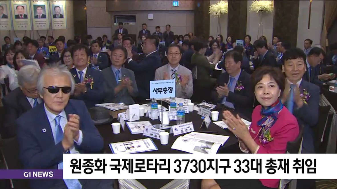 국제로타리 3730지구 제32대.33대 총재 이.취임식이 오늘, 원주 아모르컨벤션웨딩홀에서 이양수 국회의원과 조창진 G1강원민방 회장 등 각계 인사와 회원 등 5백여 명이 참석한 가운데 열렸습니다.