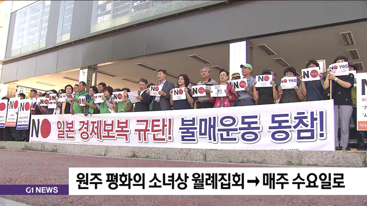 원주 평화의 소녀상 시민모임은 일본 아베 정권의 경제보복이 철회될 때까지 원주 평화의 소녀상 건립에 참여한 65개 단체가 릴레이로 매주 수요일 집회를 연다고 밝혔습니다.