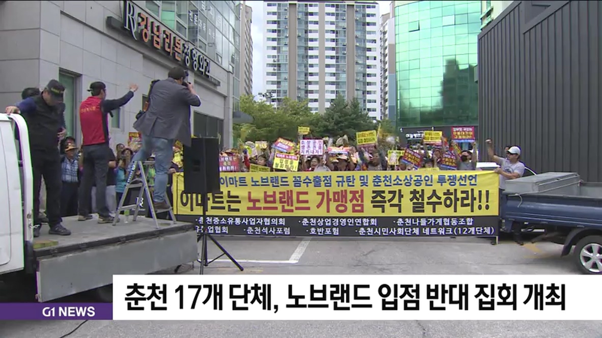 춘천 이마트 노브랜드 저지 대책 위원회는 이마트 측이 노브랜드를 직영 대신 가맹점 형식을 통해 매장을 늘리려 한다며, 가맹점이 늘게 되면 결국 골목상권은 붕괴될 것이라고 집회 이유를 밝혔습니다.