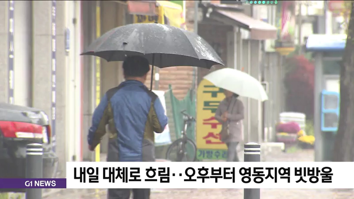 내일 강원도는 대체로 흐린 가운데, 오후부터는 영동지역을 중심으로 비가 내리는 곳이 있겠습니다.