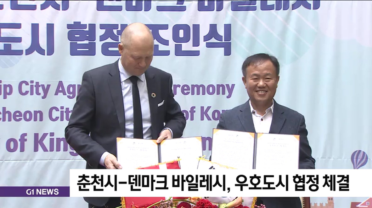 춘천시는 오늘 춘천시청 중앙정원에서 덴마크 바일레시 한스 아이너 크리스텐스 시장이 참석한 가운데, 우호도시 협정을 체결하고 두 지역 간 교류 협력을 확대한다고 밝혔습니다.