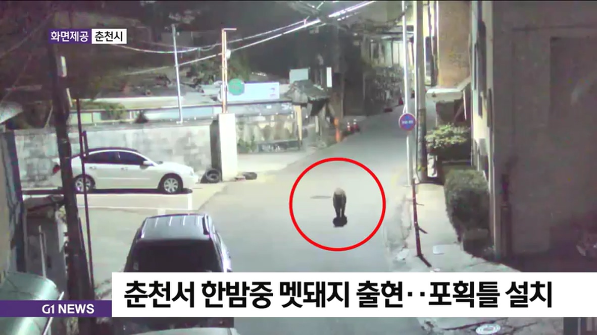 최근 춘천 도심에서 한밤 중에 멧돼지가 출현했다는 신고가 접수된 것으로 알려졌습니다.