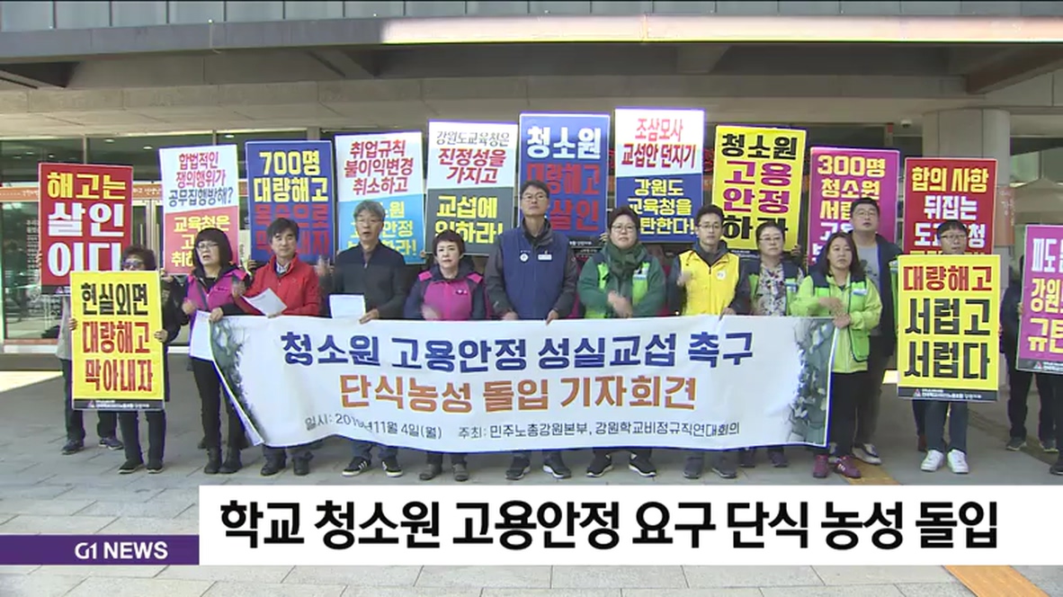 학교비정규직연대회의는 기자회견을 통해 "정부와 강원도교육청이 취업규칙에 사전심사제를 신설해 295명의 청소원이 실직하게 됐다"고 주장했습니다.