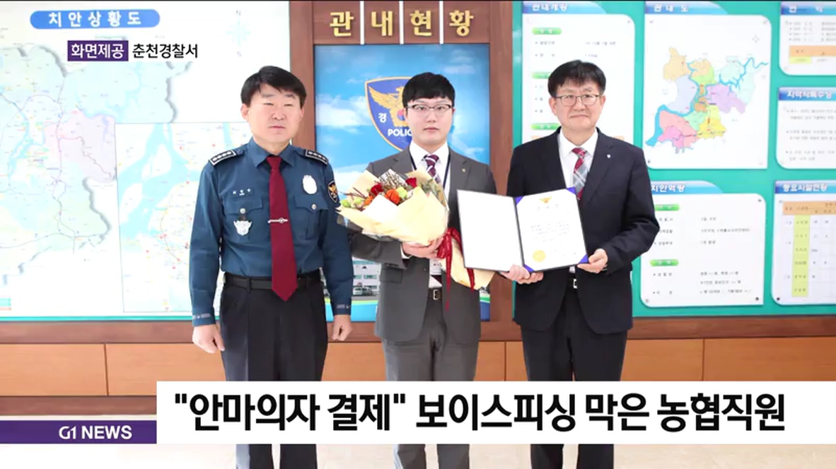 춘천경찰서는 최근 춘천에서 발생한 보이스피싱 사건과 관련해 피해를 막은 시민에게 감사장을 전달했습니다.