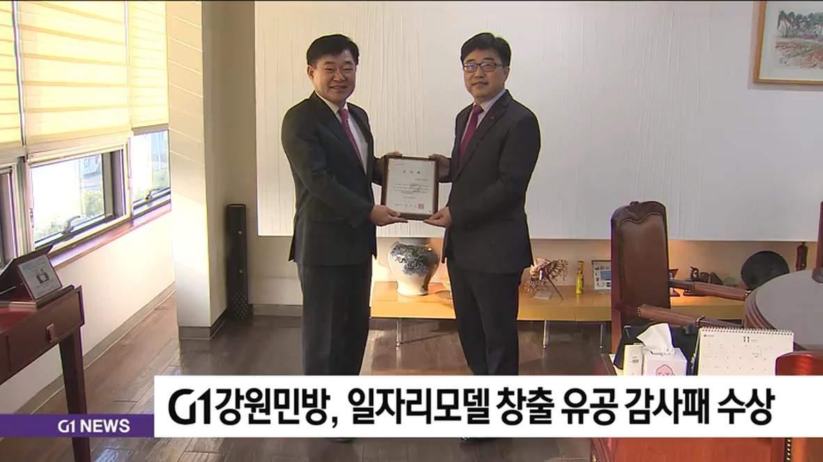 G1강원민방이 강원도형 일자리모델 창출 공로를 인정받아 강원도로부터 감사패를 받았습니다.