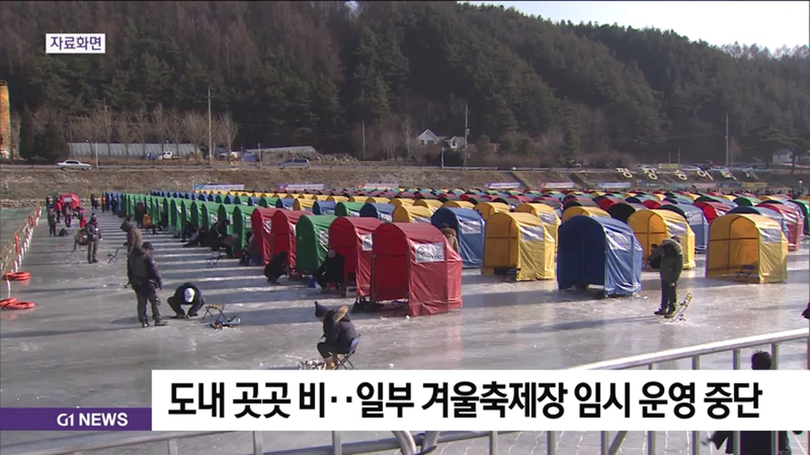 도내 곳곳에 시간당 30~80mm의 비가 내리고 있는 가운데, 일부 겨울축제장이 방문객 안전을 위해 행사운영을 일시적으로 중단하고 있습니다.