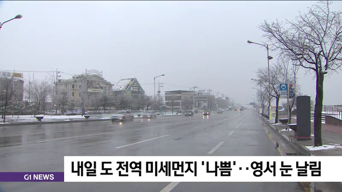 내일 강원도 전역에 미세먼지 농도가 '나쁨' 수준으로 예보된 가운데, 영서 지역에는 오전에 눈이 날리는 곳이 있겠습니다.