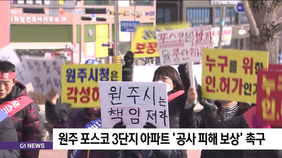 원주 포스코 3단지 아파트 비상대책위원회는 오늘(28일) 원주시청 앞에서 집회를 열고, 공사 피해에 따른 시공사의 책임 이행을 촉구했습니다.