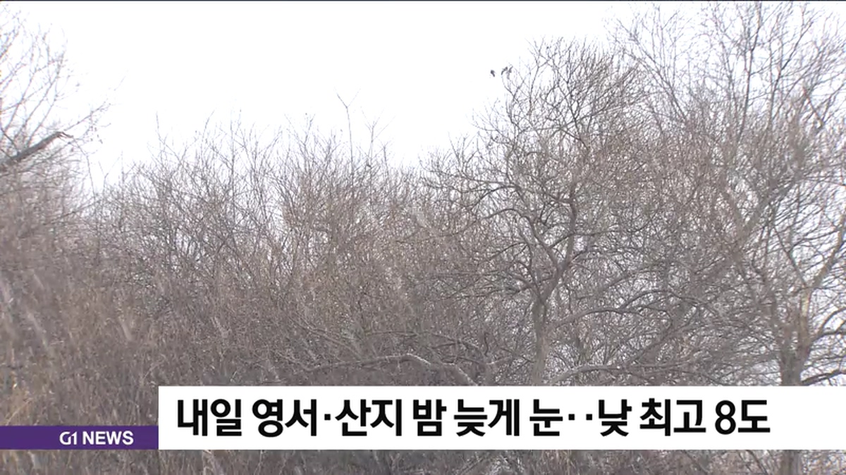 내일 강원도는 대체로 맑다가 영서지역과 산지에는 밤늦게 눈이 내리겠습니다.